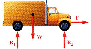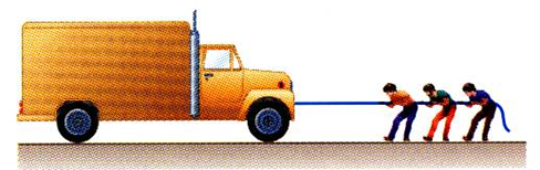 위 그림에서 차에 작용하는 외부 힘은 바깥에 있는 세 명의 사람들이 잡아당기는 힘, 그리고 각 바퀴에 걸리는 수직항력과 중력 뿐입니다.