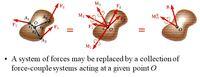 앞서 배운 내용들을 이용해서 한 rigid body에 작용하는 (각각 다른 point of application을 가진) force를 한 점에 대한 force-couple system으로 만들 수 있습니다.