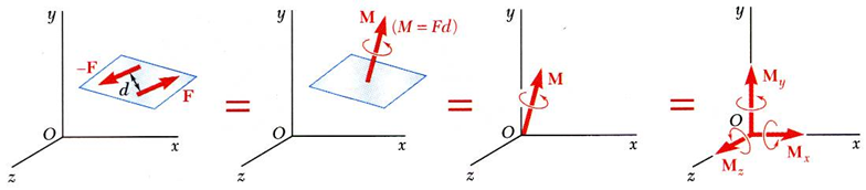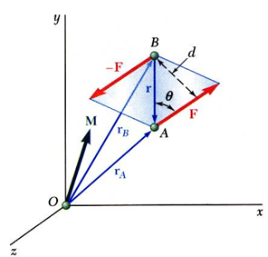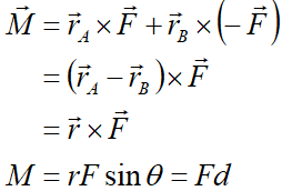 이렇게 구한 M은 $\vec{r_{A}},\vec{r_{B}}$에 관계없이 couple을 이루는 force 사이의 거리($d$)와 Force의 크기로 결정되며, 방향은 couple을 이루는 force를 지나는 평면에 대해 수직인 방향입니다.