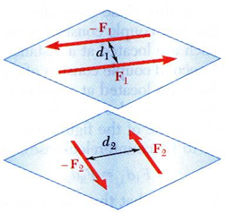만약 두 couples이 평행한 평면 위에 있고, $F_{1}d_{1}=F_{2}d_{2}$를 만족한다면 두 couples은 동일한 모멘트를 가지게 됩니다. 즉, 같은 rotation을 만드는 영향을 줍니다.