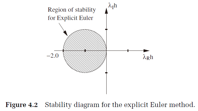 exact solution보다 stable한 영역이 더 작습니다. 즉, 원래는 stable solution이 나와야하는 문제에서 explicit euler를 쓰면 unstable한 결과를 얻을 수도 있다는 뜻입니다.