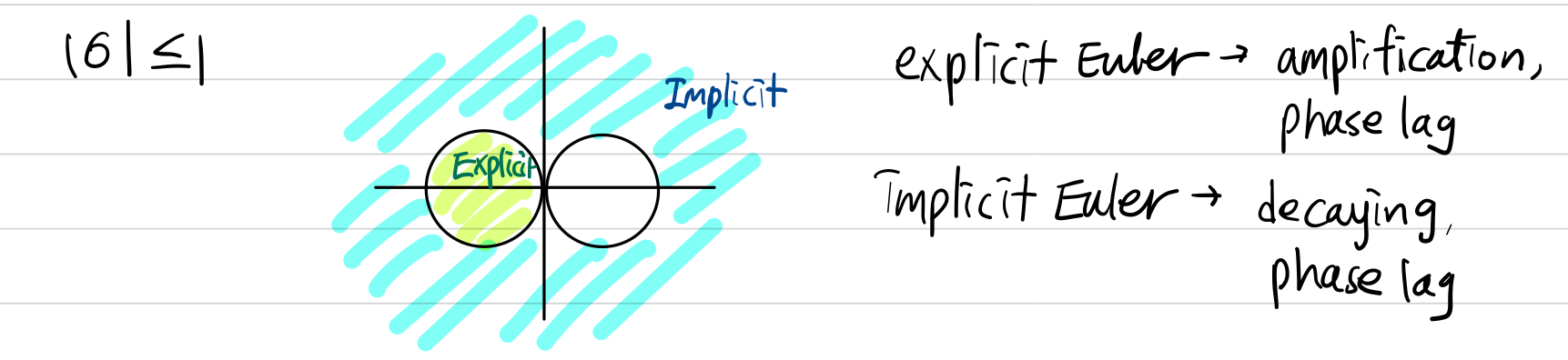 implicit euler는 explicit euler와 다르게 A-stable이지만 실제 사용하기에는 accuracy order가 낮다는 단점을 가지고 있습니다.