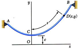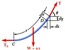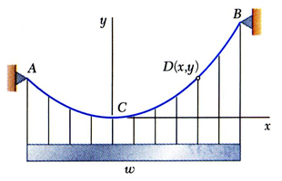 cable 무게가 균일하게 분포해있는 경우를 catenary cable case로 생각하고 분석합니다. 자신의 무게로만 hanging되어 있을 때 그 형상이 포물선보다는 쌍곡함수로 나타납니다.