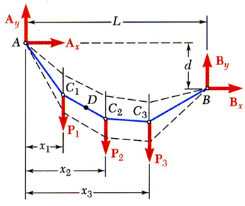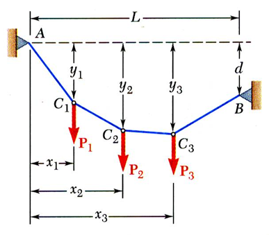 load가 vertical하게 작용하고 있고, cable의 무게는 무시하며, cable은 flexible하므로 bending에 대해 고려하지 않습니다. 또 힘이 작용하는 cable의 각 부분은 two force member처럼 취급합니다.