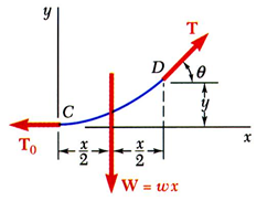 여기서 C는 cable에서 가장 낮은 지점을 위미하고 이 낮은 점을 중심으로 양 쪽으로 넓혀가면서 free body diagram을 그릴 수 있습니다. cable이 가장 낮은 지점에서는 horizontal force만이 작용하므로
