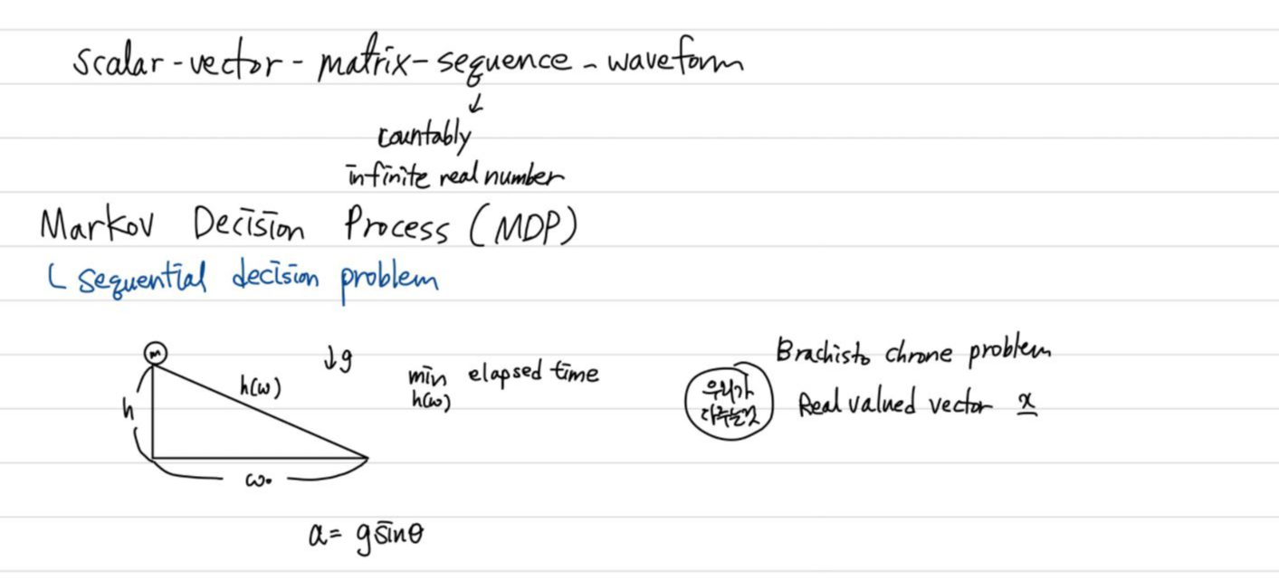 Markov decision process는 sequential decision problem에 대한 문제이고 Brachisto chrone problem은 질량이 굴러내려갈 때 그 시간을 최소화하는 길을 찾아내는 문제입니다. 즉, 함수를 최적화하는 문제이다.