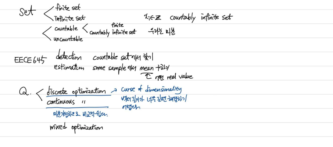 예시로는 detection문제는 countable set에서 적절한 답을 찾아내는 문제이고, estimation은 무수히 많은 값들 중에서 답을 찾아내는 문제입니다. 특정 sample을 통해 mean을 추정하는 것처럼 말입니다.