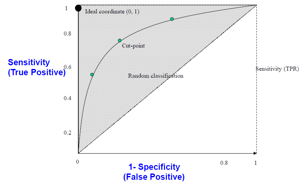 그 당시에 cut point를 바꿔가면서 그림을 그렸었는데, 안타깝게도 데이터가 편향되어있어서 specificity가 0.8에서 1 사이로밖에 나오지 않았습니다.
