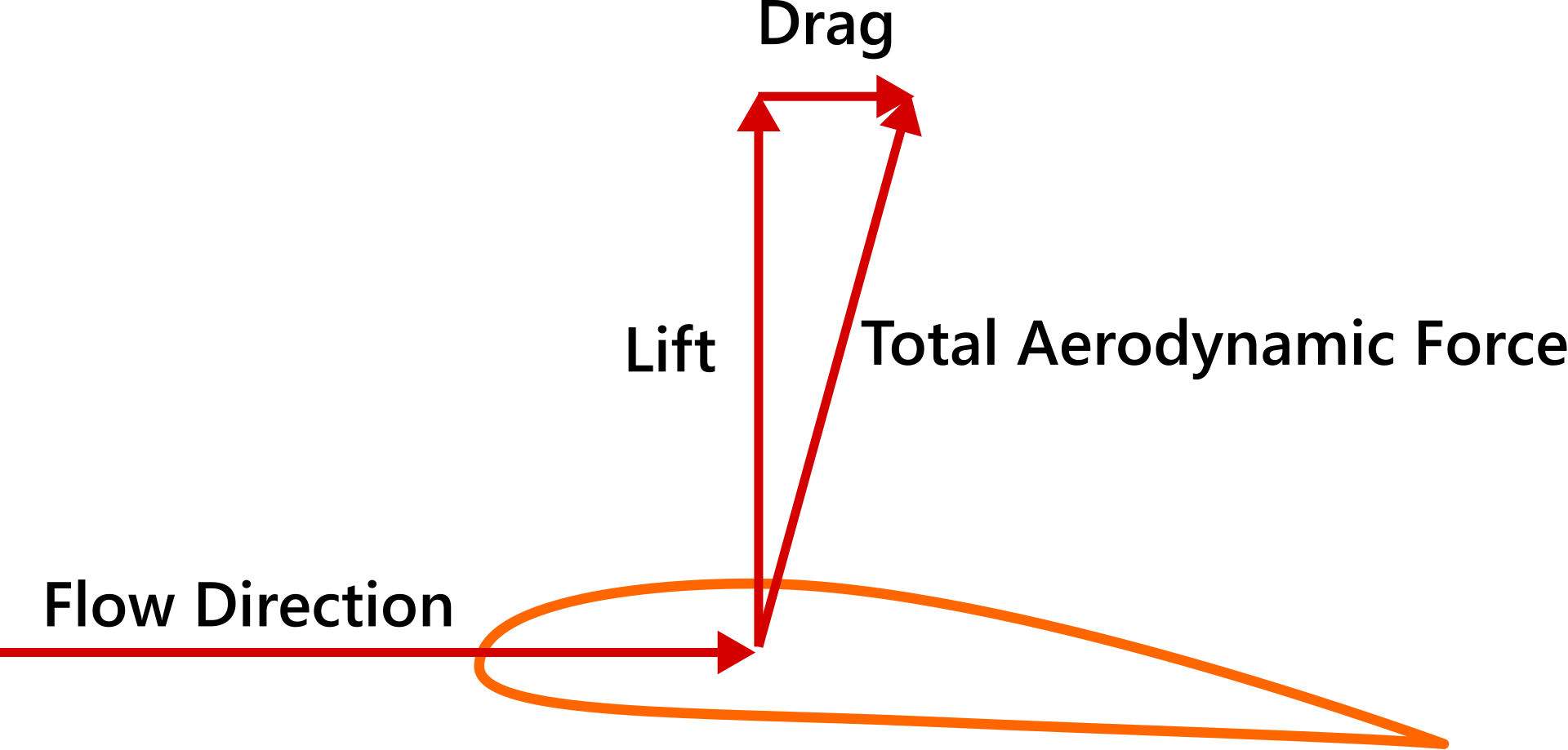 aerodynamic force R은 바람의 상대 벡터와 수직하는 방향과 평행하는 방향으로 분해할 수 있습니다.