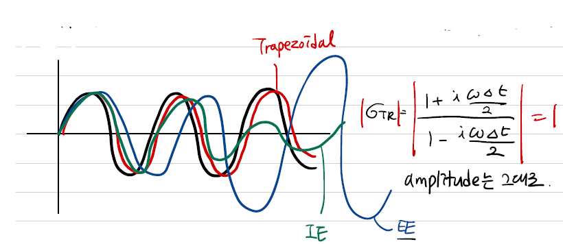 이전에 봤던 implicit euler 방법에서 phase error가 $\frac{(\omega \Delta t)^{3}}{3}$이므로 trapezoidal method의 phase error가 더 작습니다.