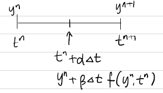 $n$스텝과 $n+1$스텝 사이에 중간 스텝을 추가할 때(2 steps) 굳이 $\frac{1}{2}\Delta t$ 간격을 갖는 것이 아니라 $\alpha \Delta t$를 정합니다.