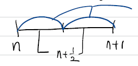 $n$스텝에서 $n+1$스텝으로 넘어갈 때 중간에 $n+\frac{1}{2}$ 스텝을 추가합니다. 중간에 한 스텝 더 추가해서 2nd order RK method(RK2로 표현)입니다.