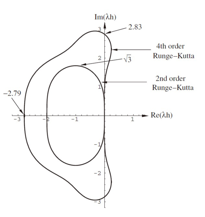 또한 stability 영역은 다음과 같습니다. RK2는 Predictor-Corrector 방법과 동일하게 나오고, RK4는 Imaginary axis에 대해서도 stable 영역이 존재하기 때문에 explicit method도 imaginary 부분을 다루고 싶을 때 사용할 수 있습니다. (지금까지 배운 explicit method들은 불가능했습니다.)