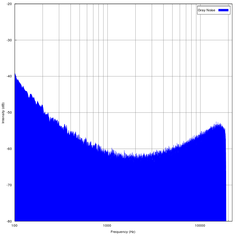 사람들에게 noise가 주파수 별로 동일한 loudness가 느껴지도록 만든 노이즈. white noise가 주파수 별로 같은 power를 가지기는 하지만 인간이 각 주파수 별로 느끼는 정도가 다르기 때문에 조작을 가한 것이다.