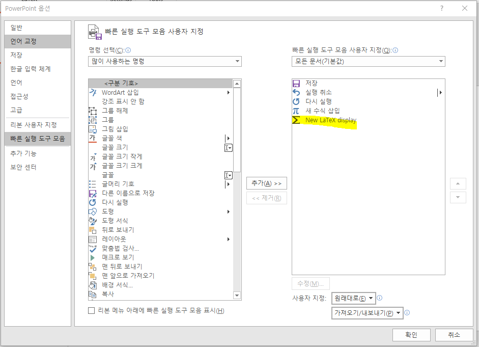 이렇게 수식을 입력할 때마다 IguanaTeX 탭으로 가서 New LaTeX display를 누르기 귀찮다면, 마이크로소프트 문서프로그램에서 제공하는 빠른 실행 도구 모음에 New LaTeX display를 추가하면 된다.
