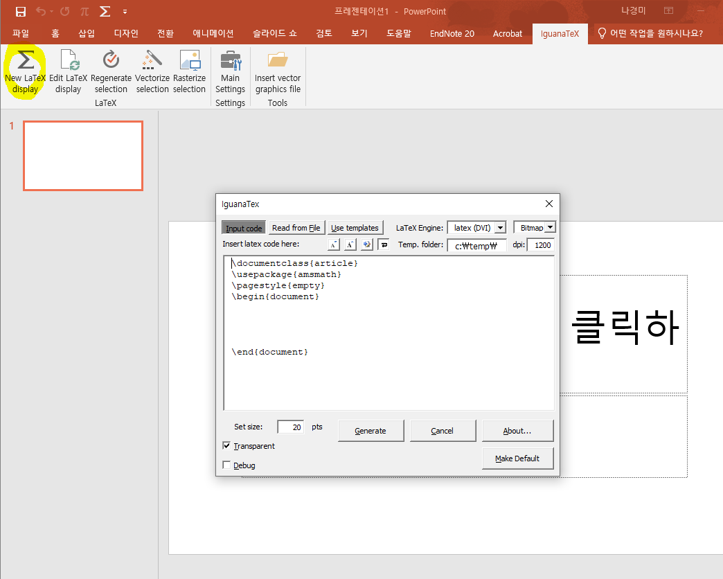 이렇게 모든 프로그램을 설치하고 파일경로까지 입력했으면 IguanaTeX 탭에 있는 New LaTeX display를 눌러서