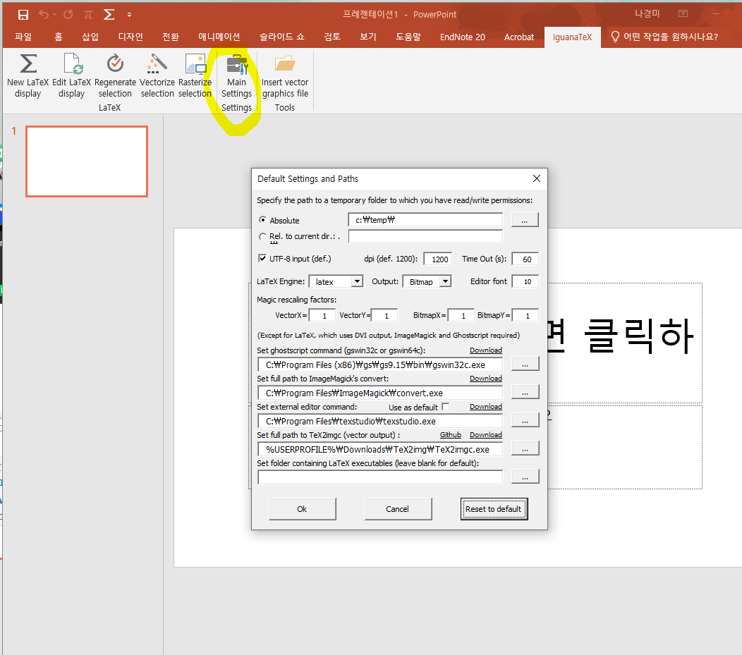 다음과 같이 IguanaTeX > Main settings 에 들어가 각 프로그램의 파일 경로를 입력해놓아야하기 때문이다.