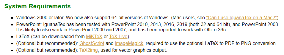 IguanaTeX은 PPT에 수식을 넣기 위해 존재하는 add-in 프로그램으로, 무료이고 LaTeX 문법을 그대로 쓸 수 있다. LaTeX 문법을 쓰면 그 LaTeX을 컴파일하고 수식을 PNG와 같은 그림 형태로 변환해준다.