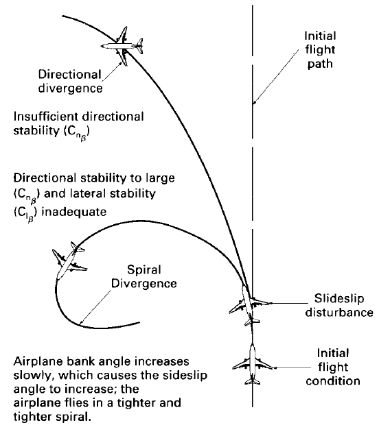 directional stability를 의미하는 $N_{\beta}>0$가 충분하지 않으면 sideslip이 발생했을 때 비행기 동체가 그 방향으로 제대로 돌아가지 못해 원했던 방향과 다른 방향으로 비행하는 것이다.