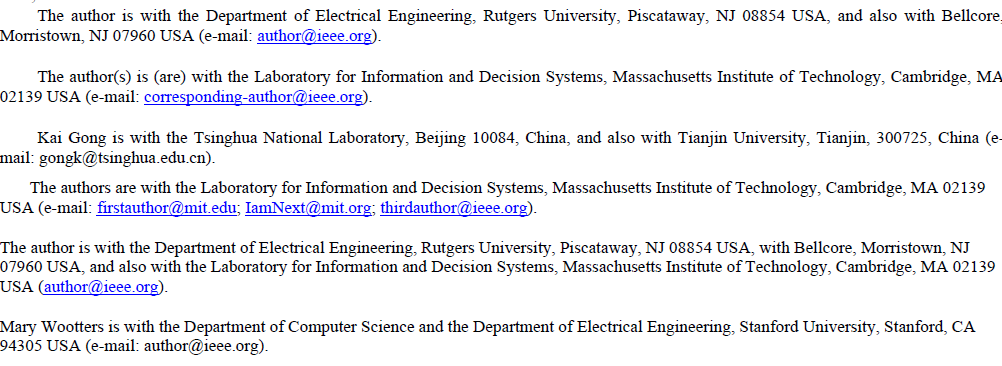 예시를 보면 세 명의 저자가 소속이 다를 때, line으로 구별함을 보여주고 있다. 이메일 주소는 구체적인 예시로 안 보여줬지만 세미콜론으로 구별한다. (이는 직접 검증해봐야할 부분)