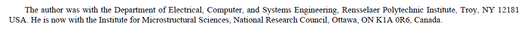 저자가 소속된 곳에서 현재 직무를 안하고 있을 때 아래 예시처럼 적는다. (이것을 on leave from이라고 표현하는데, 정확히는 휴가라는 말이라서 혼동스러움) 아래 예시를 보면 논문을 쓴 당시의 소속이 먼저 적혀있고 on leave from (소속) 이 아마 이전 소속이 아닐까 추측하고 있다.
