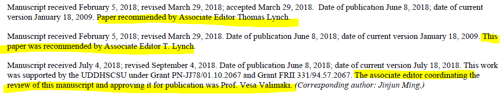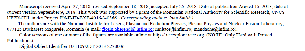 첫 번째 문단의 경우에는 논문의 received, revised, and accepted dates가 포함되어있다. revision이 한 번 이상으로 이루어졌을 때는 각 날짜를 모두 적는다. 또한 IEEEXplore에 올라왔을 때를 구분할 수 있는데 위 그림에서 있는 Date of publication은 IEEEXplore에 "single article"이 올라왔을 때(preprint or rapid post--ePub date)이고 the date of current version은 "final--paginated" version이 IEEEXplore에 올라왔을 때이다.
