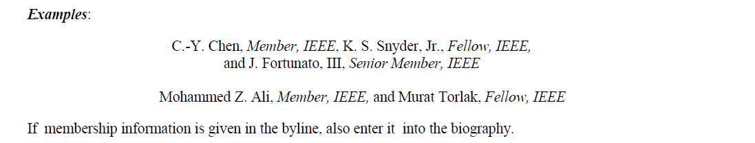 위와 같은 예시를 보면 저자의 이름 외에 membership grades를 추가해서 넣어놓았다. 닉네임을 쓰지 말고 본인의 본명을 쓰라고 한다. 한국인의 경우에는 홍길동처럼 성(Last name, family name) + 이름(First name)으로 쓰지만 위처럼 영어로 저자 이름을 쓸 때는 길동 홍(Gildong Hong) 이렇게 쓴다. 성을 먼저 쓰는 경우는 H. Gildong 또는 Hong, Gildong 이렇게 쓴다.
