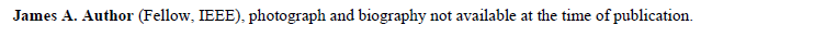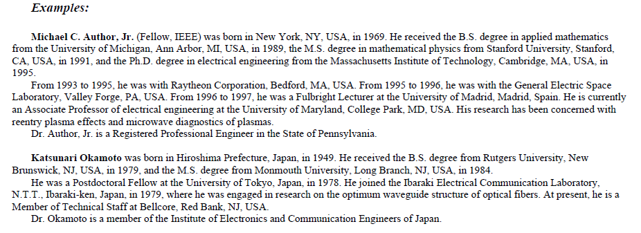 저자의 풀네임으로 시작하고 IEEE membership history를 적는다. IEEE membership history는 없는 경우도 있다. 저자 사진은 어깨와 머리가 나온 professonal image로 하고 최근 사진일수록 좋다.