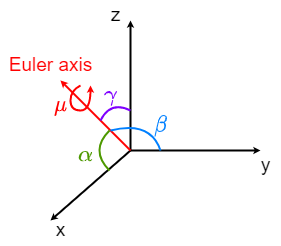 어떤 축에 대해서 $\mu$(rotation angle)만큼 회전하면 여러 번의 회전을 단 한 번의 회전으로 표현할 수 있을 때, 이 축을 오일러축(Euler axis)이라고 한다. 오일러축은 내가 설정한 좌표계 $xyz$에서 각각 $\alpha, \beta, \gamma$의 각도를 가지고 있다고 표기한다. $\mu$는 rotation angle이므로 $0\leq \mu <2\pi$ 이다.