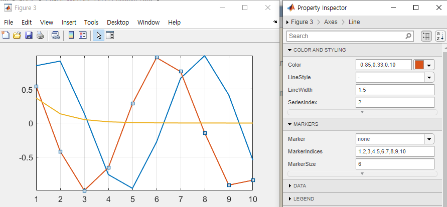 내가 figure 창에서 해본 것은, 여러 개 그려진 plot 중 하나를 골라서 지우는 것, plot의 색상과 두께를 지정하는 것이 있다.