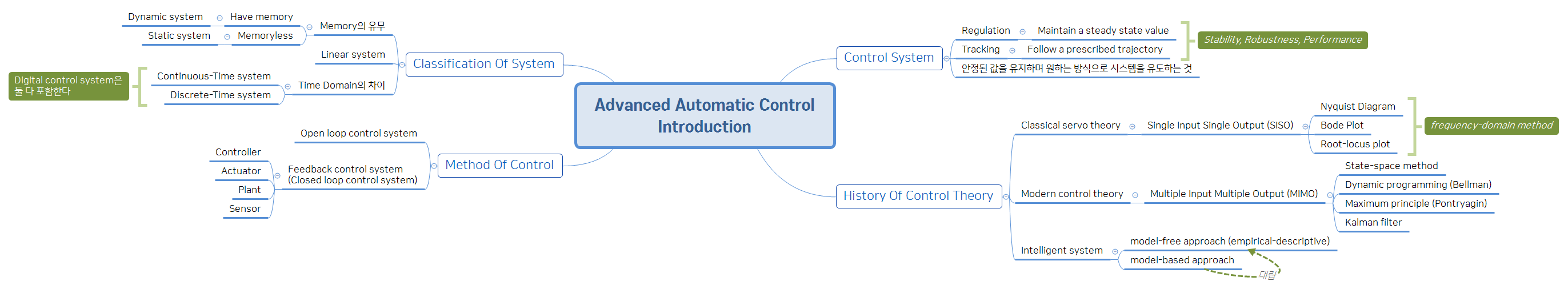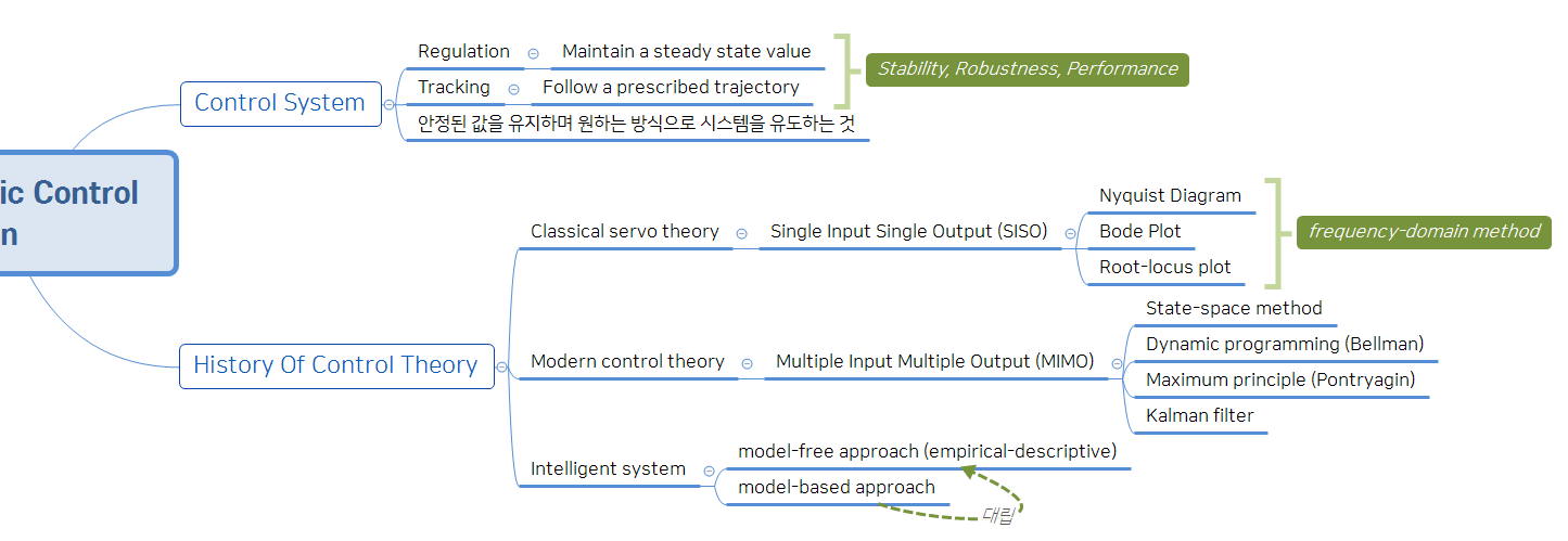 - Classical control theory : Single Input Single Output(SISO), Frequency domain에서 해석하는 기법들 (ex. Bode plot, Nyquist plot, Root-locus)