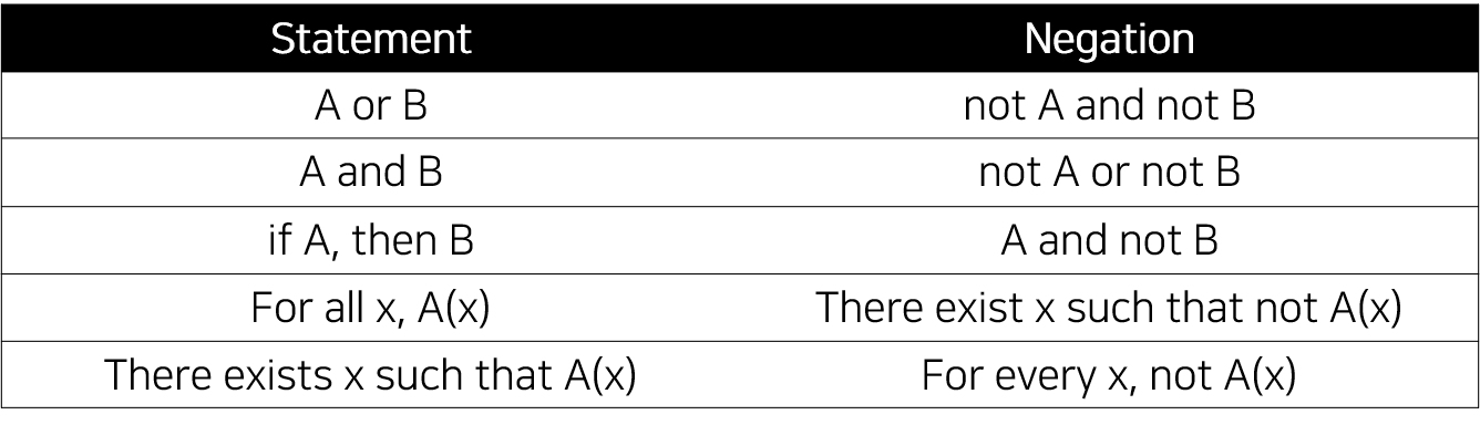 4-5) 네 번째 statement와 다섯 번째 statement는 for all, any, every를 어떻게 부정하는지에 대해 알려준다. for all 이 들어간 증명은 모든 사례에 대해서 증명하기가 매우 어려우므로 부정을 이용해서 증명하는 편이 더 쉬울 수 있다.