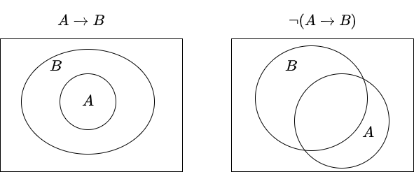 <A이면 B이다>라는 문장을 부정하고 싶으면, A에 속해있으면서 B는 아닌 것이 존재함을 보이면 된다. 따라서 앞서 본 $A\wedge \neg B$가 의미적으로 그렇게 해석할 수 있다.