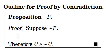 Statement이자 preposition을 P이 참임을 증명하고 싶다고 하자. 그리고 증명과정에서 부수적으로 나오는 statement $C$와, $\neg C$가 동시에 성립해야하는 상황을 만든다. 이 때 $C\wedge \neg C$ (C and not C)인 경우는 무조건 FALSE라는 사실을 기억하자.