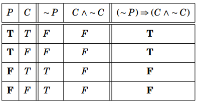 다음 표를 보면, $P$와 $(~P)\Rightarrow (C\wedge \neg C)$은 논리적으로 동일하다. 즉, $(\neg P)\Rightarrow (C\wedge \neg C)$가 참임을 보이면 $P$도 참이 되는 것이고, $(\neg P)\Rightarrow (C\wedge \neg C)$가 거짓임을 보이면 $P$도 거짓이 된다. 주의할 점은 $(\neg P)\Rightarrow (C\wedge \neg C)$이 참이라는 뜻이 $(C\wedge \neg C)$이 참이라는 것과는 전혀 다르다.