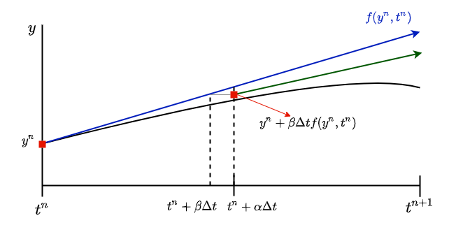 이 때 그 스텝의 시간은 $t^{n}+\alpha \Delta t$이고, 그 시간에 대응하는 상태값은 $y^{n}+\beta \Delta t f(y^{n},t^{n})$을 사용합니다. 시간이 $\alpha \Delta t$만큼 지났으므로 상태도 변했을 것이기 때문입니다. $\beta=0$이면 원래 시작했던 상태인 $y^{n}$을 쓰는 것이고 $\beta = 1$을 쓰면 $y^{n}$에서 구한 기울기를 가지고 예측한 다음 스텝의 상태인 $y^{n}+\Delta t f(y)$를 쓰는 것입니다.