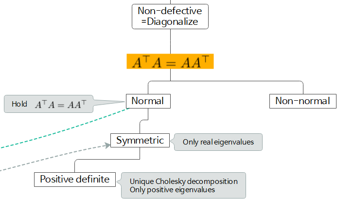 normal matrix 중에는 symmetric matrix (complex domain까지 포함하면 Hermitian matrix)가 있다. symmetric matrix는 분류기준으로 보았을 때 항상 n개의 선형독립인 eigenvectors가 존재하며, eigenvalues는 항상 real이다.
