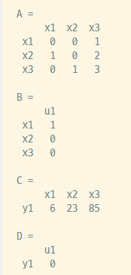 A = [0,1,0;0,0,1; 1,2,3] ; B = [0;0;1] ; C =[4,5,6] ; D = 0 ;