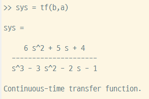 하지만 내가 처음에 시도한 것은 transfer function $G(s)=\frac{6s^{2}+5s+4}{s^3-3s^2-2s-1}$을 companion matrix로 만드는 것이기 때문에 이전에 observable, controllable canonical matrix로 만드는 것처럼 시도해보았다.