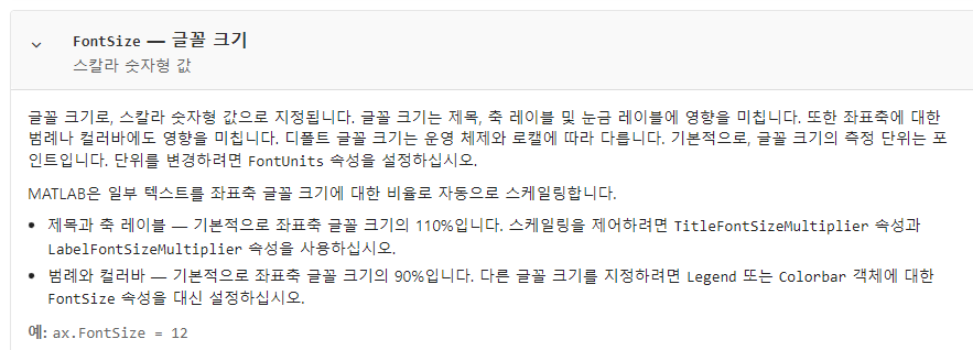 3번에서 보면 axes font size default값을 지정했을 것이다. 여기서 title과 xlabel, ylabel은 이 폰트 사이즈의 배수로 표현해서 지정할 수 있다. axes font size는 축에 있는 눈금의 사이즈를 결정하는 것이기 때문이다. axes font size가 title에도 영향을 미치는데 그에 대한 설명은 MATLAB의 help center에 잘 나와있다.