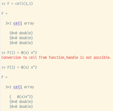 cell array의 indexing에 주의해야한다. 위와 같이 함수 핸들을 cell로 변환할 수 없다고 나온다.