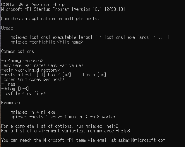 참고로 Linux에서는 <mpirun>이라는 명령어를 쓰고 windows에서는 <mpiexec>라는 명령어를 쓴다고 한다.