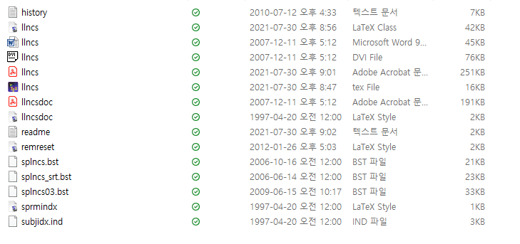 Springer conference 양식은 폴더 파일 안에 LaTeX를 사용할 때 필요한 것들을 제공해준다.