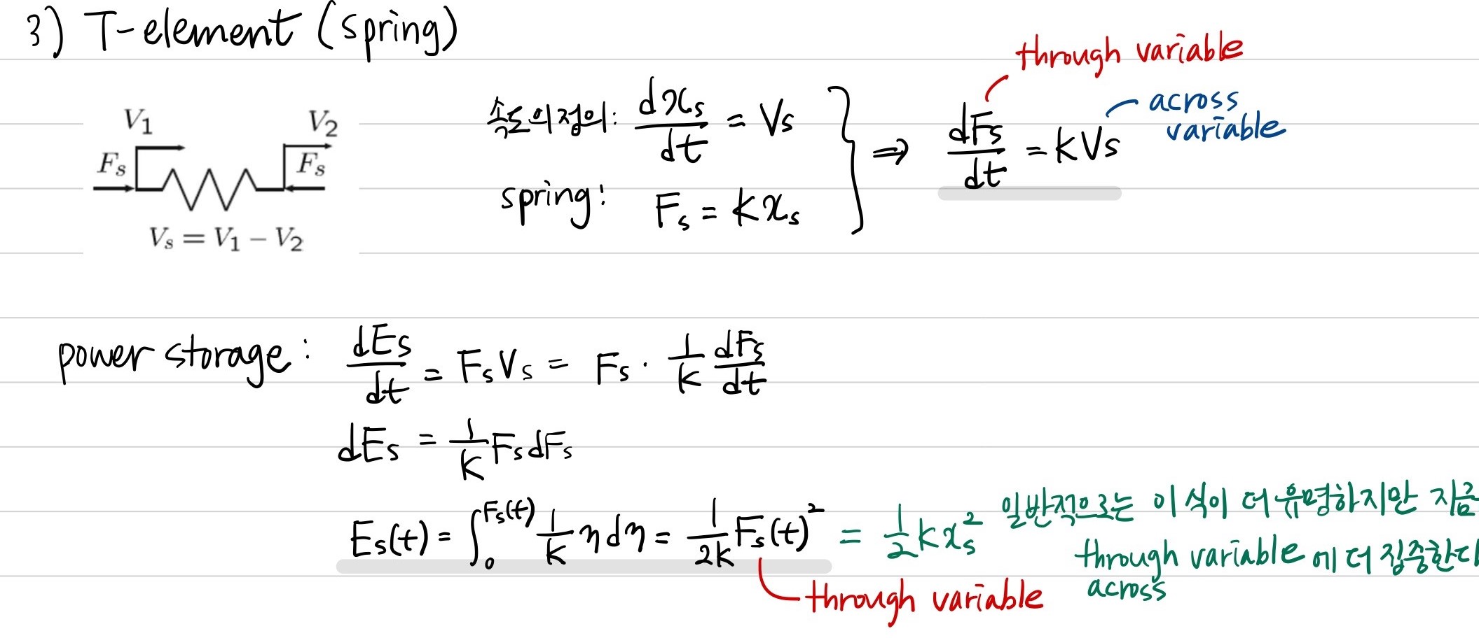 마찬가지로 spring에서의 through variable과 across variable의 관계식을 구하고, 에너지 식을 유도해냅니다.