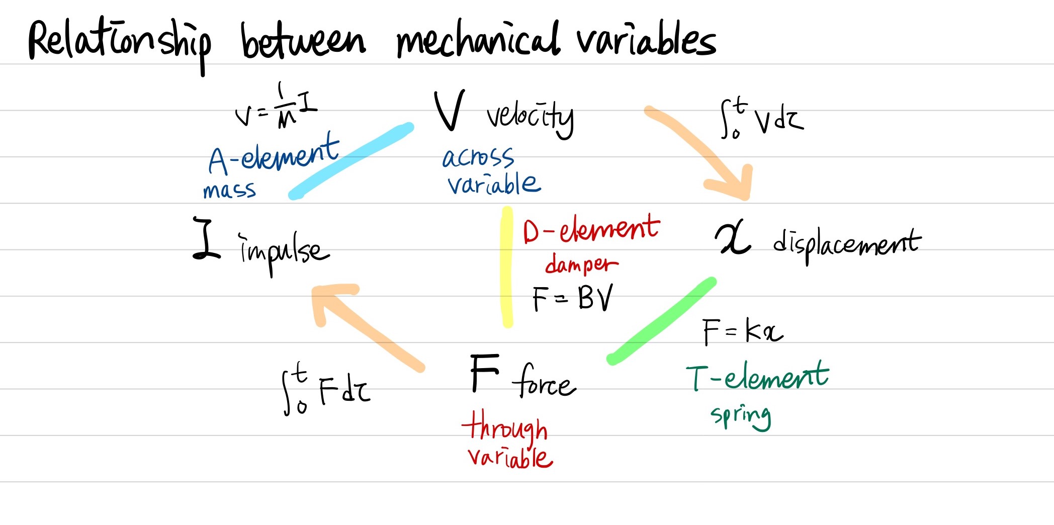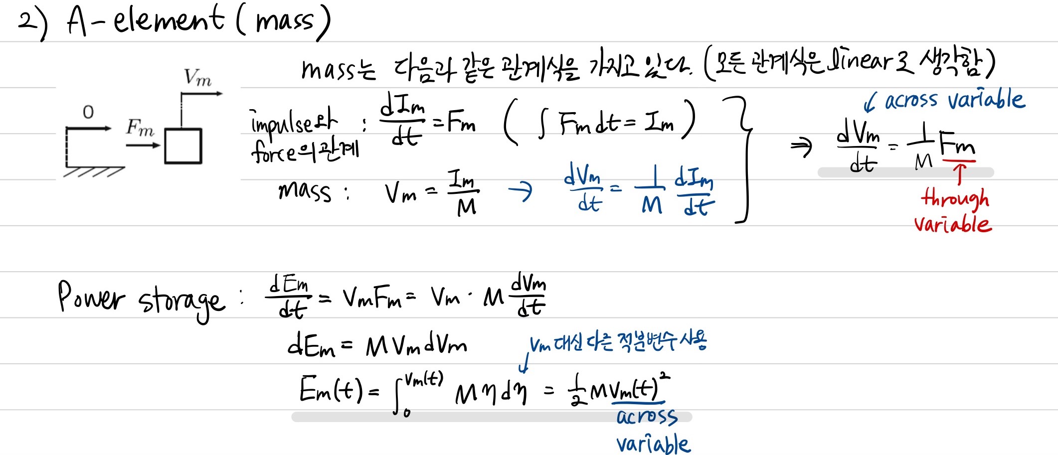 impulse와 displacement가 각각 through variable, across variable의 적분된 값이기 때문에 mass와 spring은 through variable과 across variable의 미분방정식으로 나타낼 수 있는 것이다.