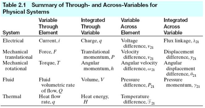 아래의 표는 각 energetic system의 through variable과 across variable를 정리한 표입니다.