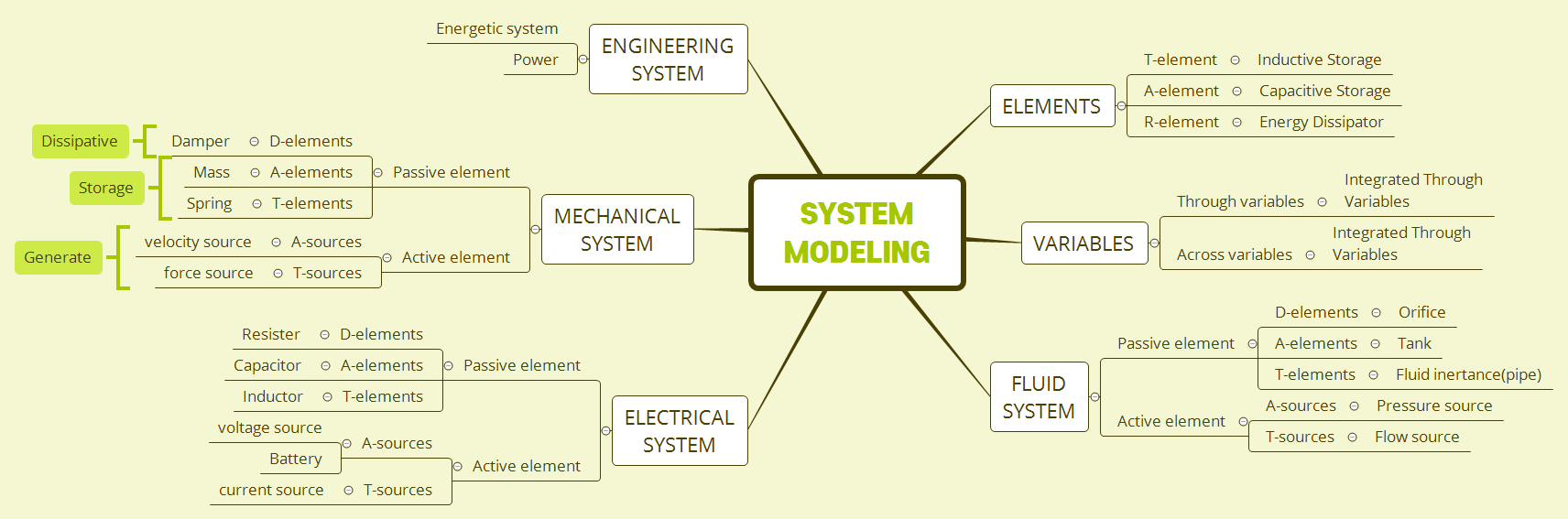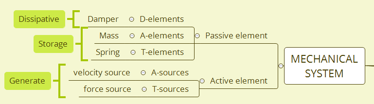 mechanical system은 위의 그림에서 알 수 있듯이, Passive element와 Active element로 구분하고 그 하위에 또 element가 존재합니다. Active element에는 source가 있는데 source는 power를 generate하는 역할을 합니다.