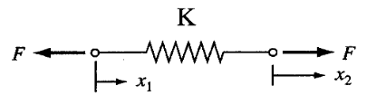여기 translational spring이 있습니다. 우리는 특별한 조건이 있지 않는 이상 spring을 mass가 없다고 가정합니다. 이럴 때 이 spring에 걸리는 힘 F는 스프링 양끝 모두 같습니다. 만약 양끝에 걸리는 힘이 다르면 net force가 0이 아니고 질량은 0이므로 가속도가 무한으로 발산합니다.(F=ma)