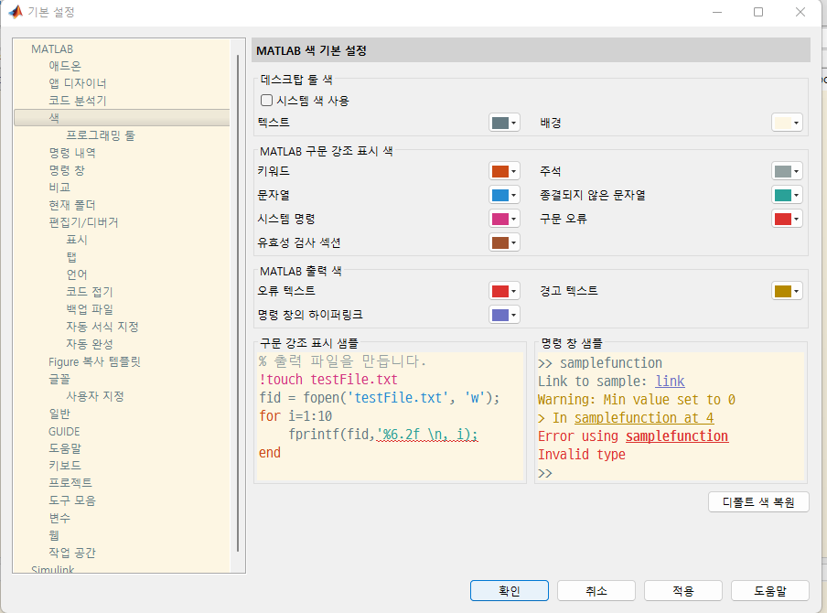 다음과 같이 텍스트들의 색상을 다 바꿀 수 있다. 하위항목의 [프로그래밍 툴]로 들어가면 프로그래밍과 관련된 경고에 대한 색상 등 다른 색상 설정들도 있다.