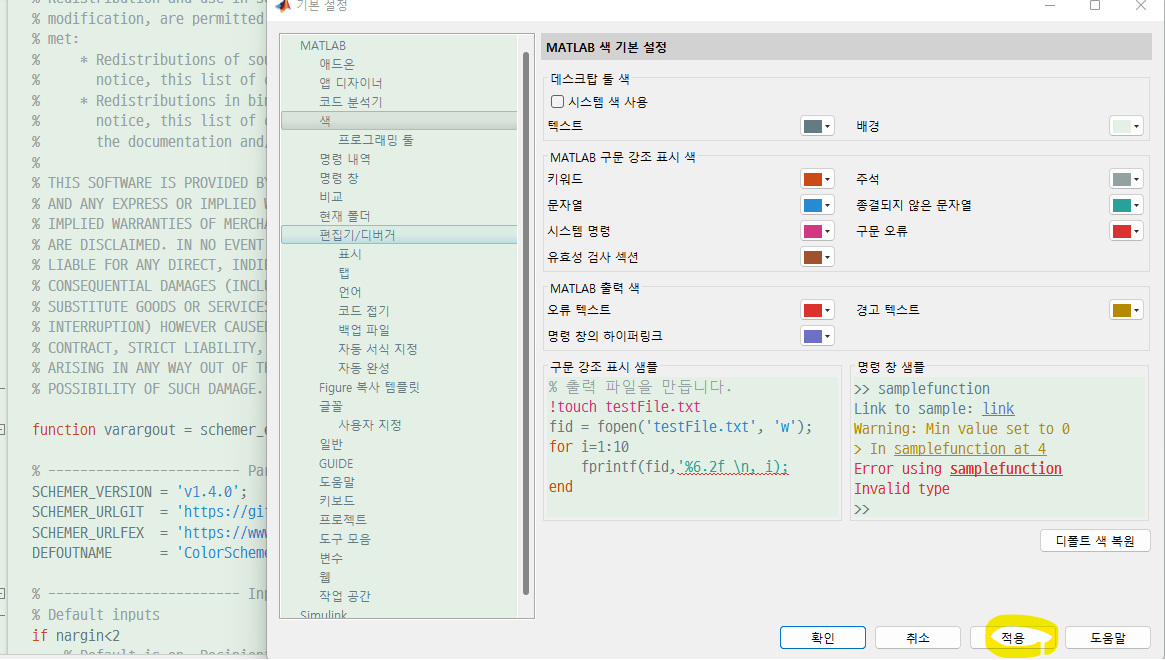 위 깃허브의 matlab-schemer를 보면 schemer_export.m이라는 함수가 있고 이는 내가 설정한 preference를 내보내는 함수이다. 자세한 내용은 코드 안에 주석으로 잘 적혀있다.